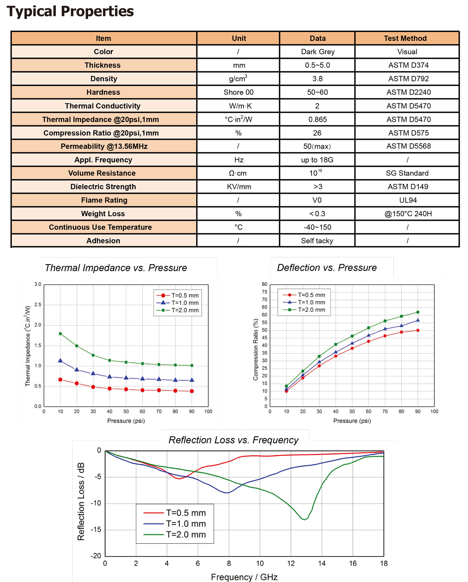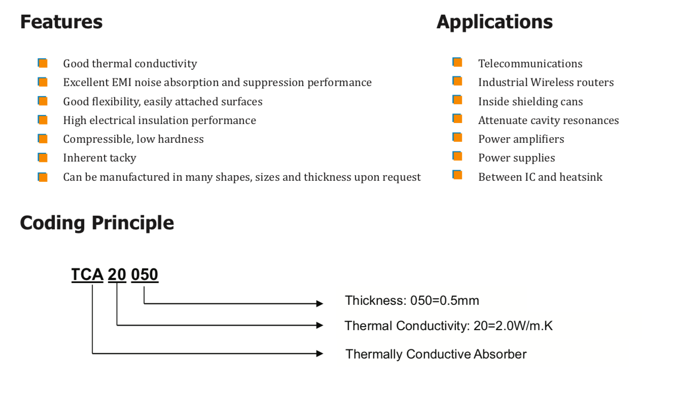 TM TCA系列導(dǎo)熱吸收材料是一種填充陶瓷和鐵氧體顆粒的硅基復(fù)合材料。設(shè)計(jì)用于吸收電磁噪聲(諧振腔、串?dāng)_和耦合)并填充熱界面之間的間隙。TCA系列吸收材料具有自粘性,組裝時不需要任何膠帶。" />