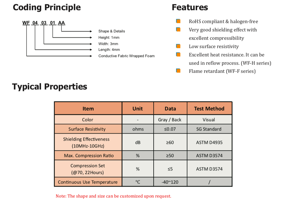 TM WF系列導(dǎo)電布包裹泡棉由高導(dǎo)電織物、PU泡棉芯和 導(dǎo)電壓敏丙烯酸粘合劑。這些高度可壓縮的材料專門設(shè)計(jì)用于 提供卓越的EMI屏蔽和接地性能,并提供高度防塵和防潮保護(hù)。 EM-WF系列產(chǎn)品容易調(diào)整尺寸所以特別適用于計(jì)算機(jī)、智能手機(jī)、液晶顯示器/電視和電信制造行業(yè)的固定墊圈應(yīng)用。" />